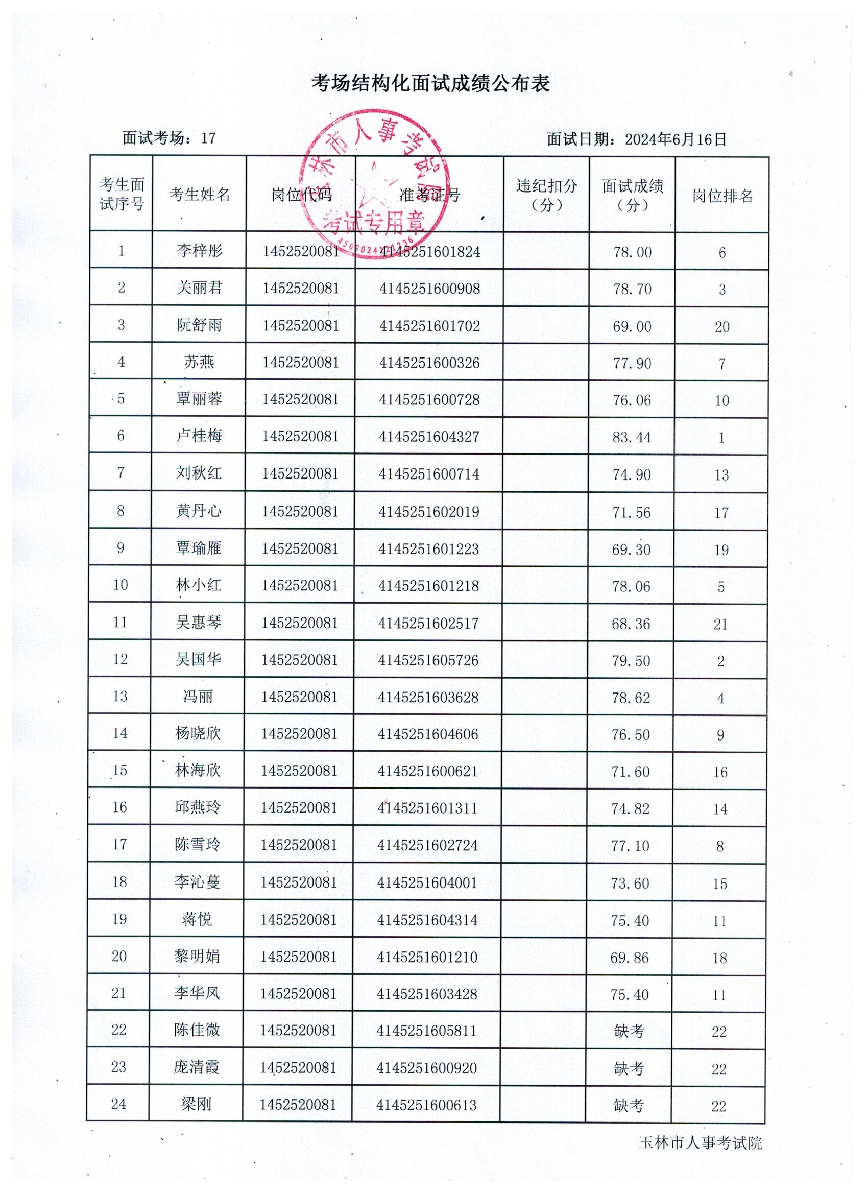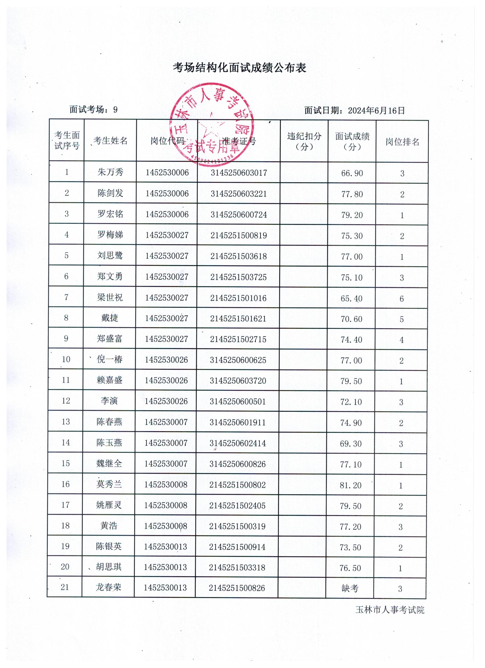 原文標題:2024年玉林市直(含玉州區、福綿區、玉東新區)事業(yè)單位公開(kāi)招聘人員面試成績(jì)公布(6月16日)