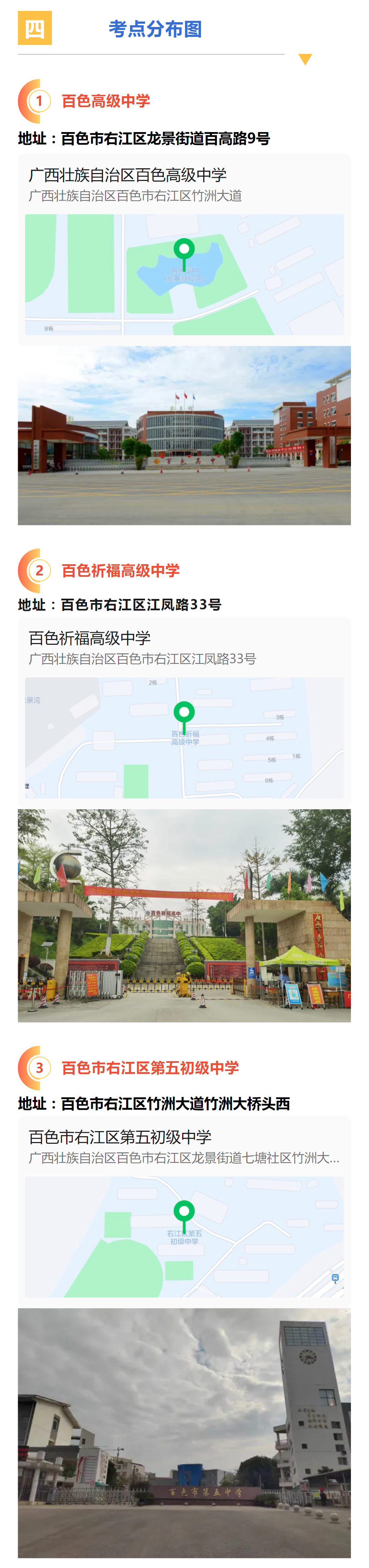 百色高級中學(xué)、百色祈福高級中學(xué)、百色市右江區第五初級中學(xué),考生具體考點(diǎn)以準考證上地點(diǎn)為準。