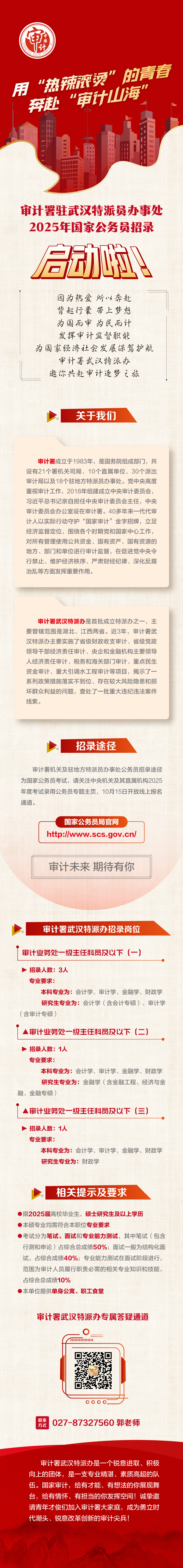 審計署駐武漢特派員辦事處2025年國家公務(wù)員招錄啟動(dòng)!
