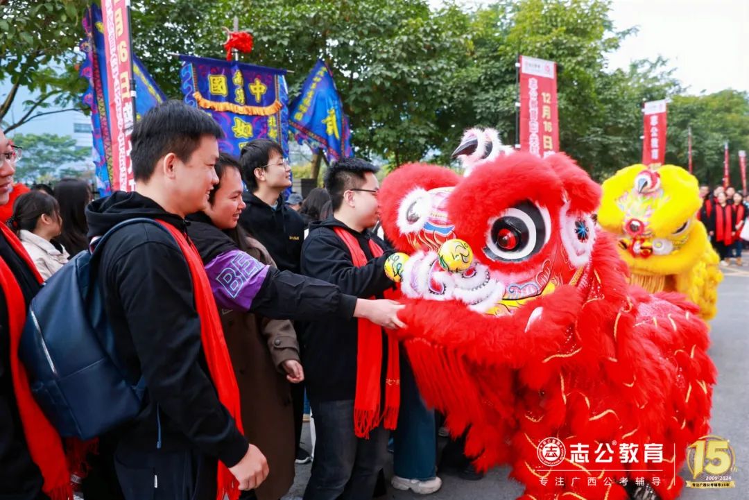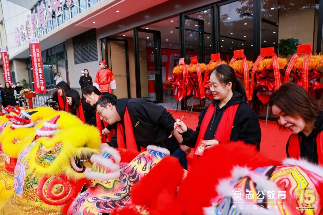志公教育還專(zhuān)門(mén)請來(lái)了舞獅隊,舞獅點(diǎn)睛是重頭戲,董事長(cháng)李勇帶領(lǐng)著(zhù)公司領(lǐng)導們手持毛筆蘸取朱砂,對獅頭天庭進(jìn)行點(diǎn)睛。