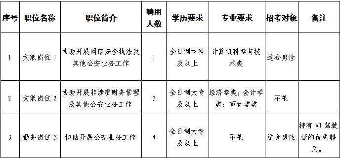 (六)同等條件下,優(yōu)先招聘公安烈士和因公犧牲公安民警、在職公安民警子女、退役士兵、見(jiàn)義勇為積極分子和先進(jìn)個(gè)人、警察類(lèi)或政法類(lèi)院校畢業(yè)生、有政法工作經(jīng)驗的人員;