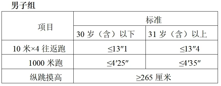 參照《關(guān)于印發(fā)公安機關(guān)錄用人民警察體能測評項目和標準(暫行)的通知》(人社部發(fā)〔2011〕48號)的項目及測試規則,結合《公安民警體育鍛煉達標手冊》成績(jì)標準,體能測評的項目和標準如下: