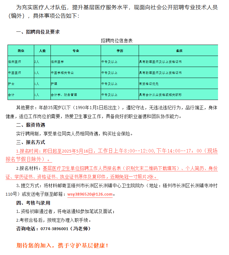 2025年梧州市長(cháng)洲區長(cháng)洲鎮中心衛生院公開(kāi)招聘公告