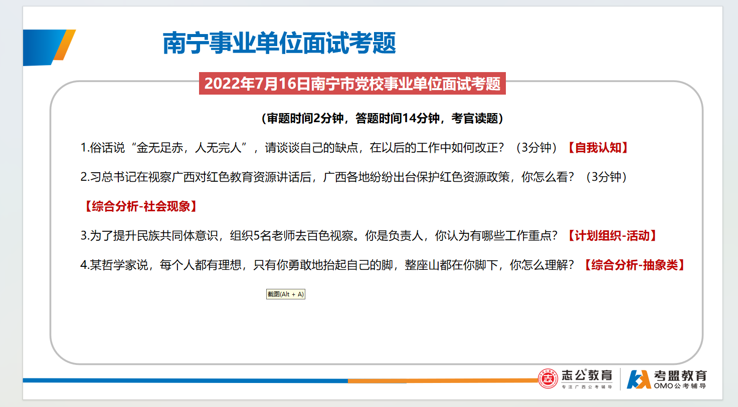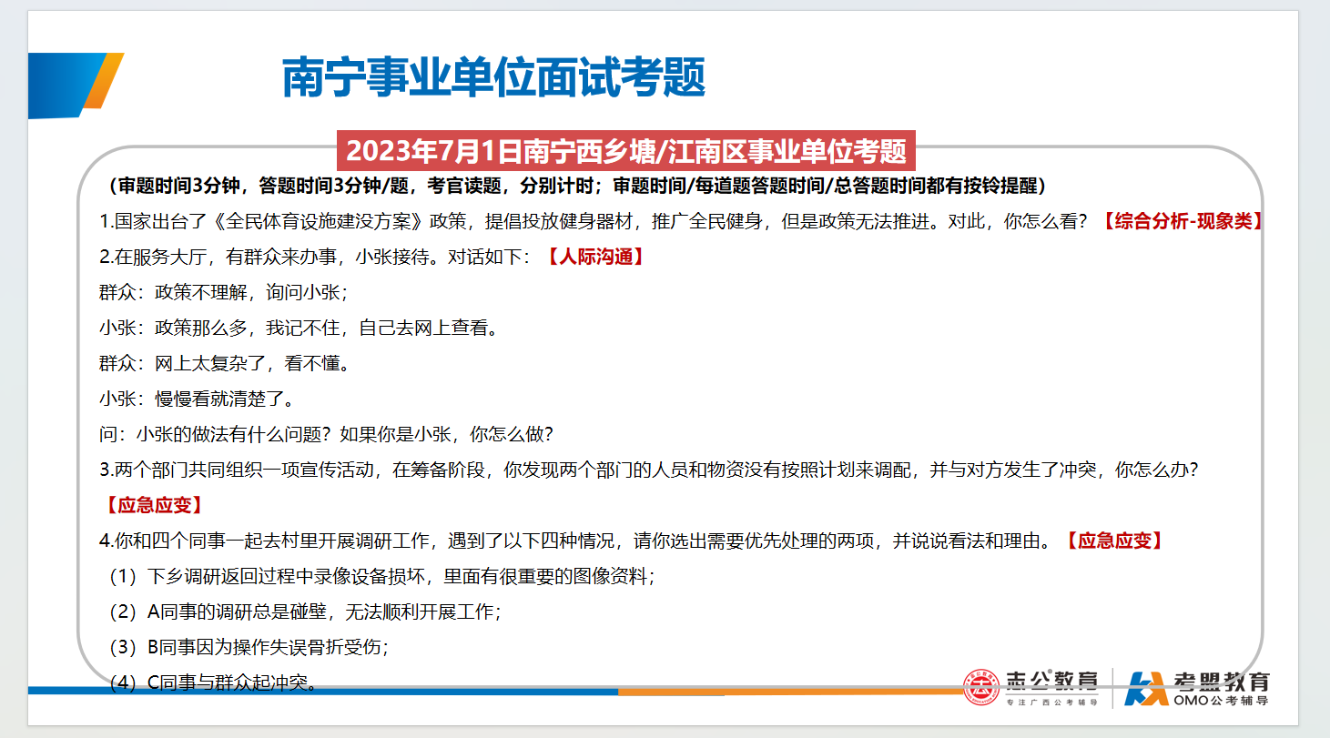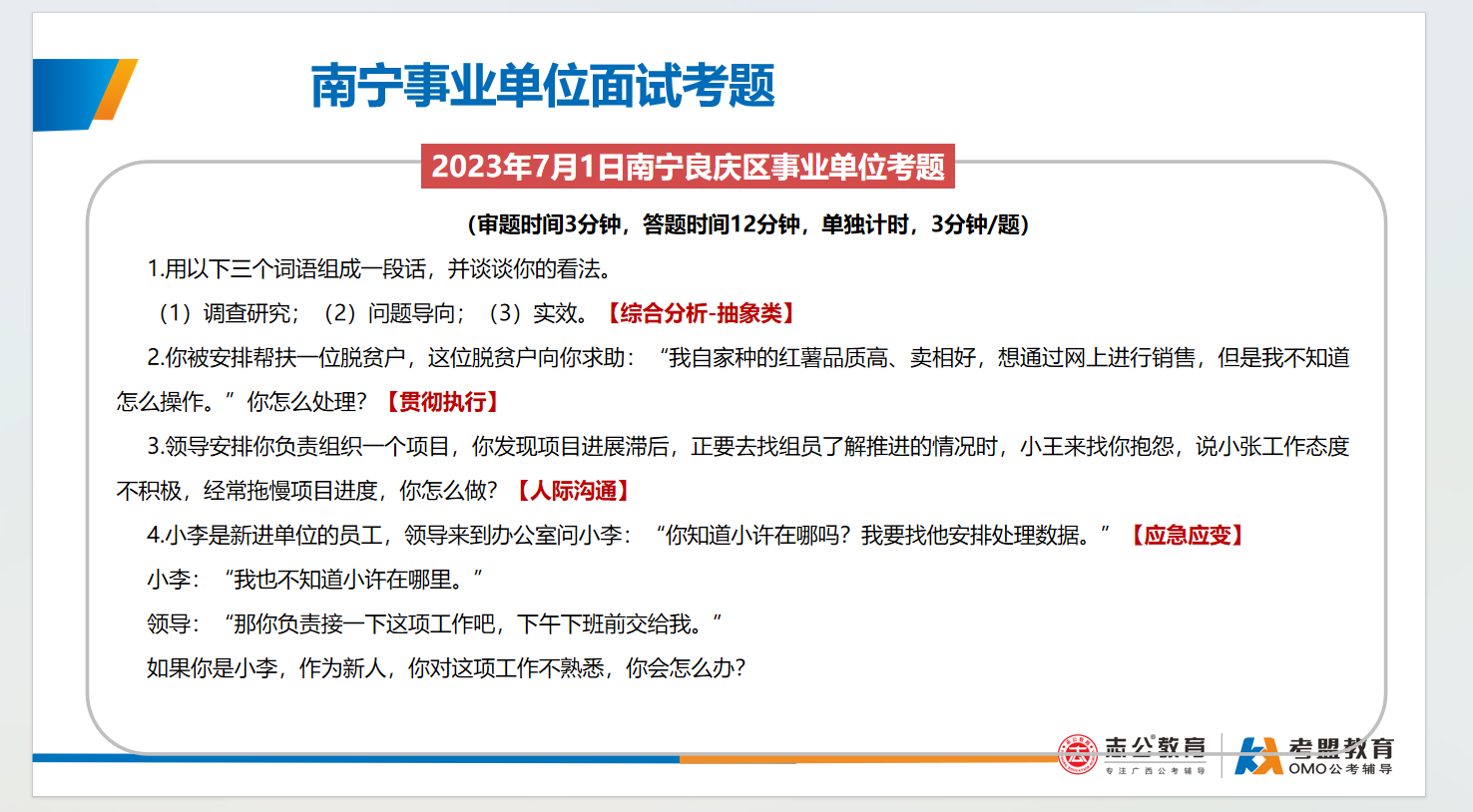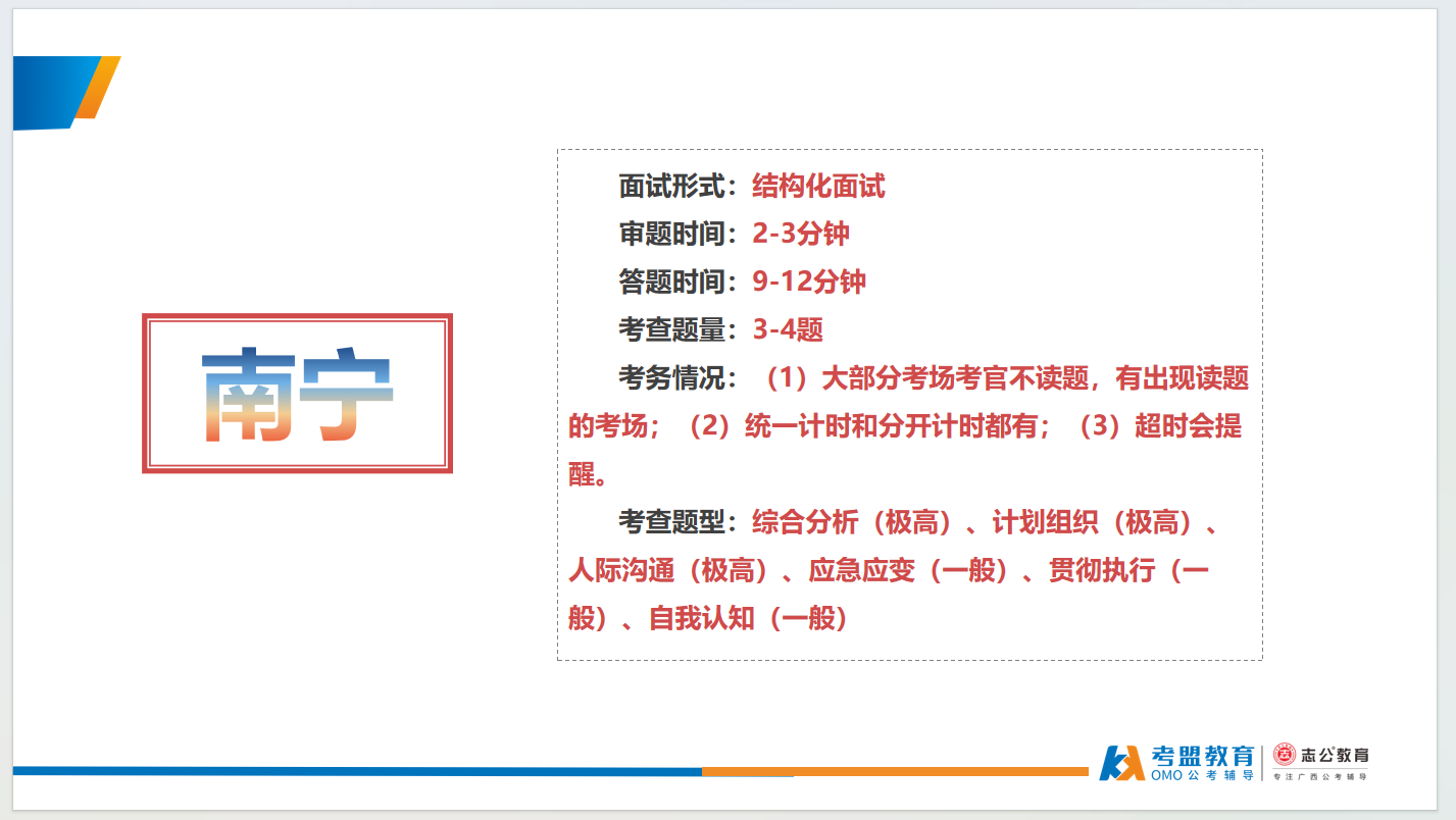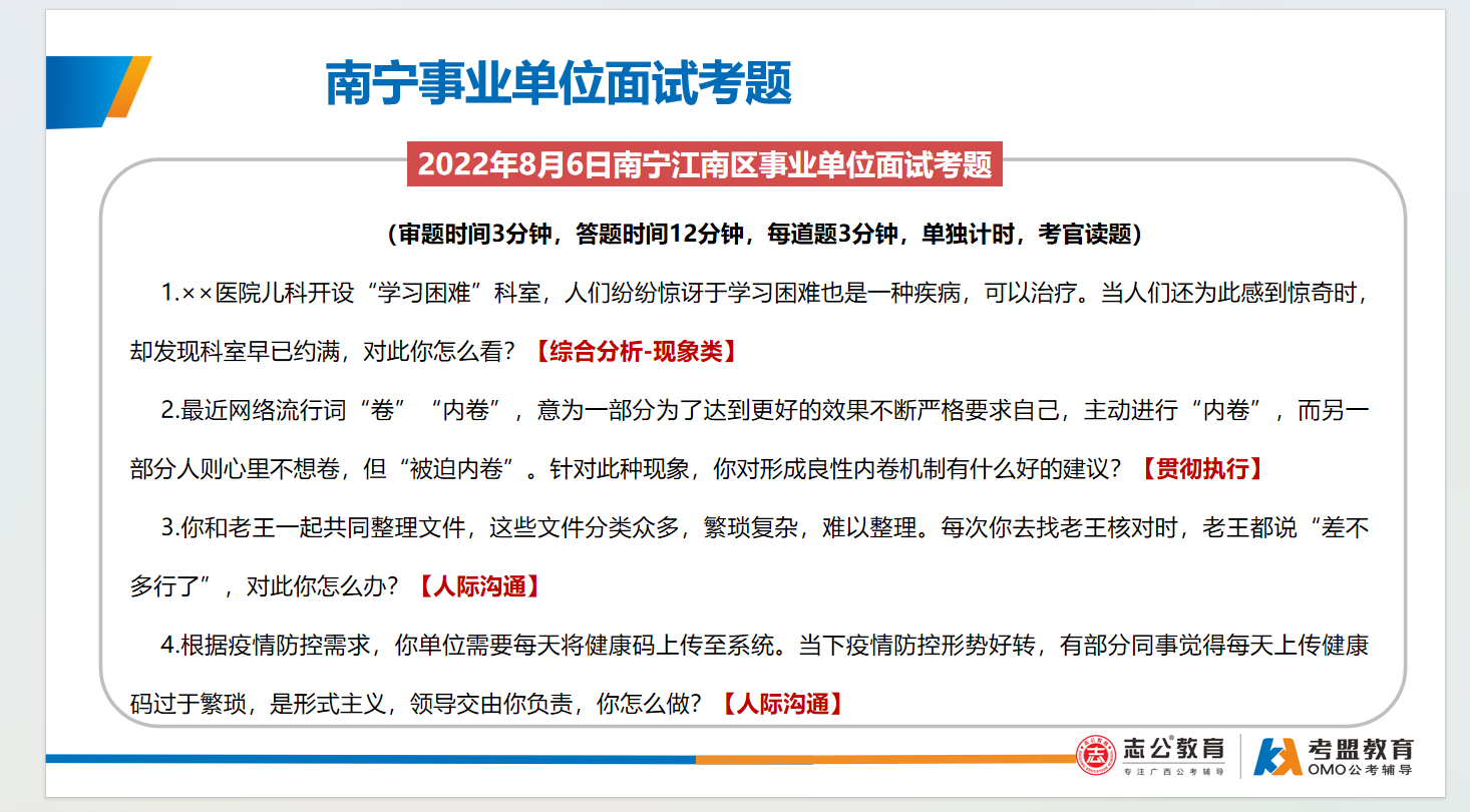 南寧事業(yè)單位面試主要采用結構化面試形式、考查題量有3-4題,答題時(shí)間為9-12分鐘,考查題型:綜合分析(極高)、計劃組織(極高)、人際溝通(極高)、應急應變(一般)、貫徹執行(一般)、自我認知(一般):