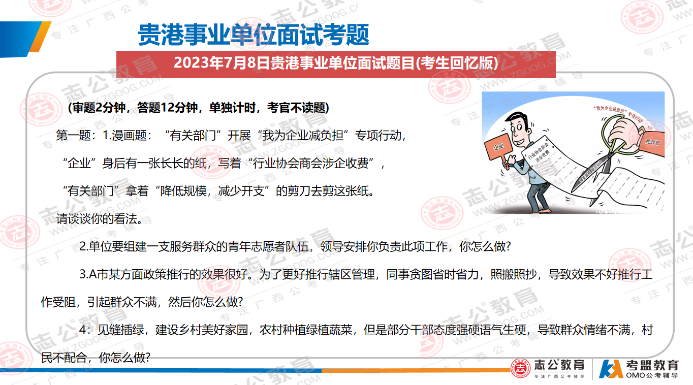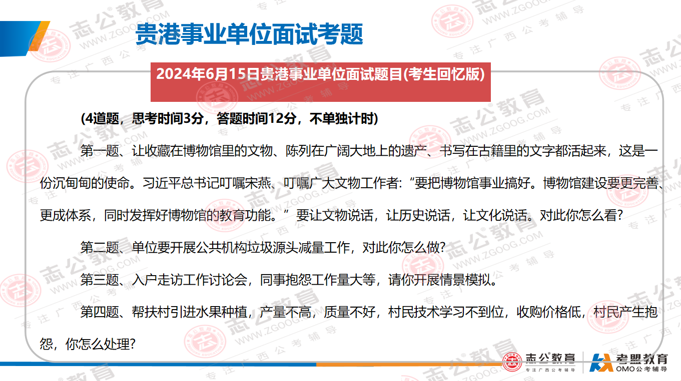貴港事業(yè)單位面試主要采用結構化面試形式;審題時(shí)間:2分鐘;答題時(shí)間:12分鐘;考查題量:4題為主??紕?wù)情況:考官不讀題、統一計時(shí)、超時(shí)會(huì )提醒??疾轭}型:綜合分析(極高)、計劃組織(極高)、人際溝通(極高)、應急應變(較高)、貫徹執行(較高)、自我認知(一般)。