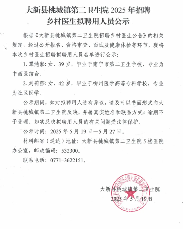 2025年崇左大新縣桃城鎮第二衛生院招聘鄉村醫生擬聘用人員公示