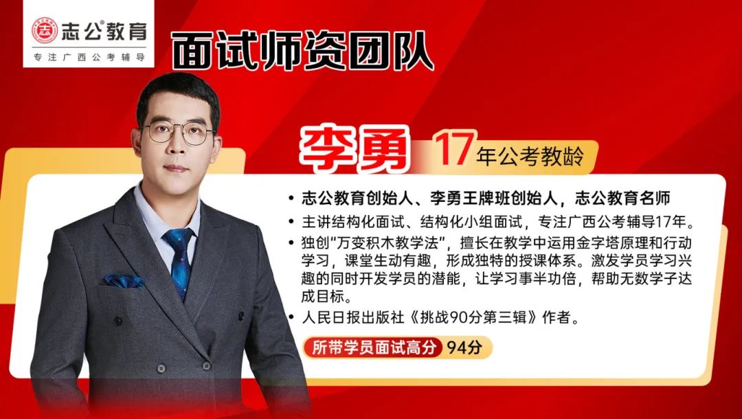 李勇——志公教育創(chuàng )始人、李勇王牌®班創(chuàng )始人,志公教育名師。主講結構化面試、結構化小組面試,專(zhuān)注廣西公考輔導17年。獨創(chuàng )“萬(wàn)變積木教學(xué)法”,擅長(cháng)在教學(xué)中運用金字塔原理和行動(dòng)學(xué)習,課堂生動(dòng)有趣,形成獨特的授課體系。激發(fā)學(xué)員學(xué)習興趣的同時(shí)開(kāi)發(fā)學(xué)員的潛能,讓學(xué)習事半功倍,幫助無(wú)數學(xué)子達成目標。同時(shí)也是人民日報出版社《挑戰90分第三輯》作者。