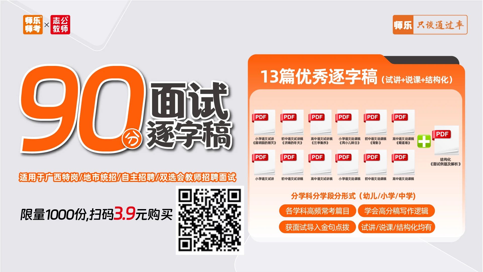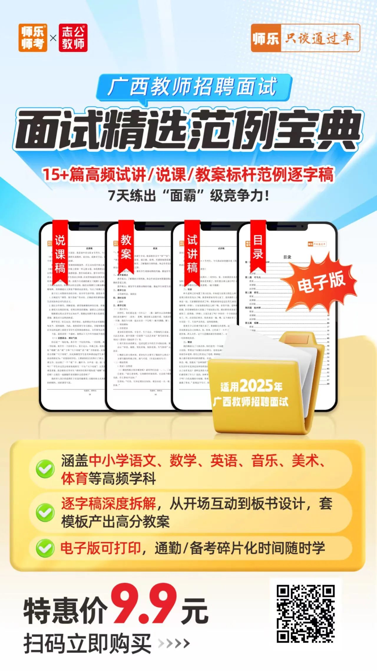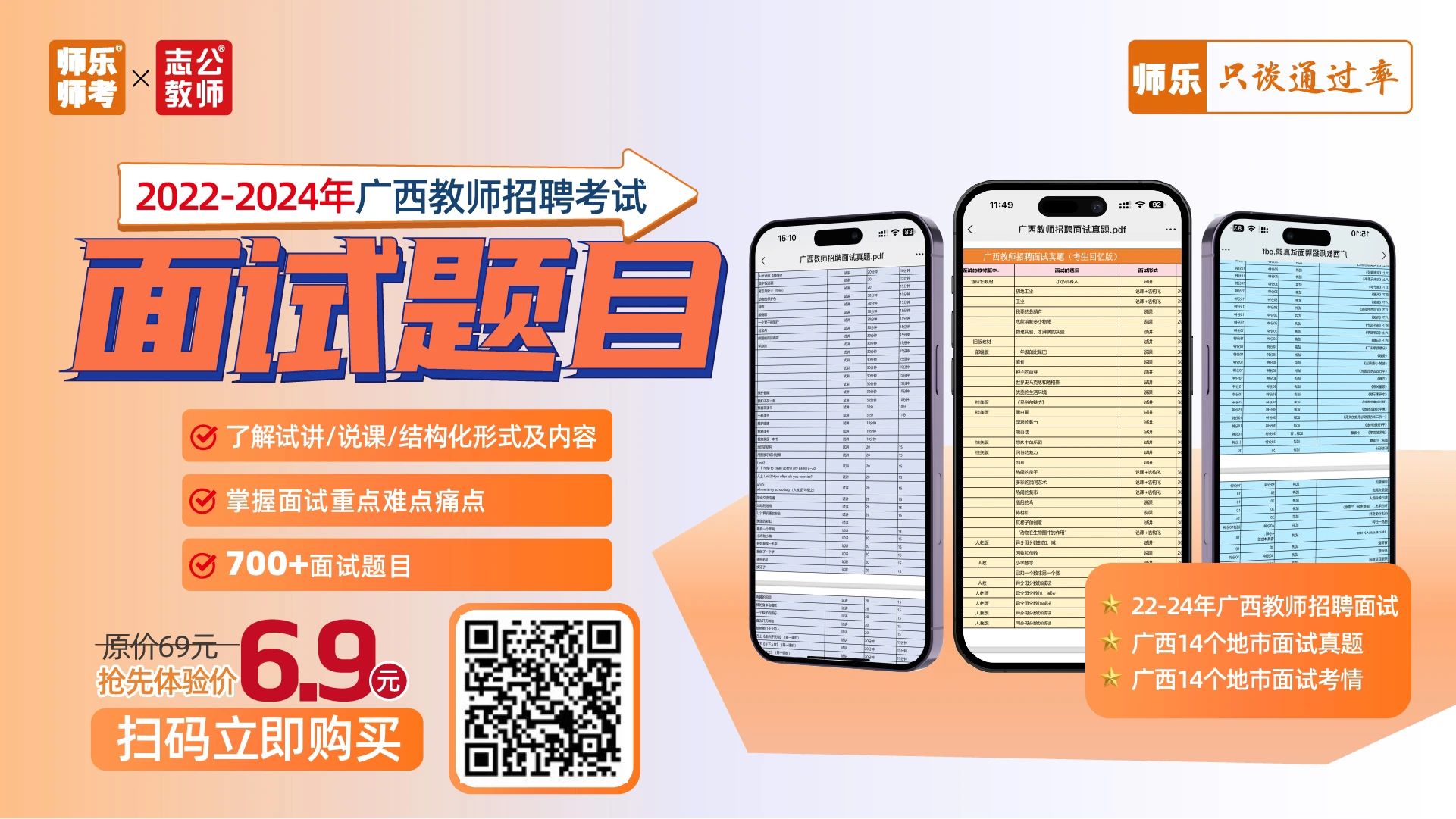 ??寫(xiě)作邏輯+面試導入金句點(diǎn)撥 ?含13+篇試講+說(shuō)課+結構化 搶先體驗價(jià):6.9元 ??14地市教招面試zhen題 了解試講/說(shuō)課/結構化形式及內容 面試禮儀課 ??面試禮儀干貨介紹 正反面案例直觀(guān)對比 ??著(zhù)裝、問(wèn)候、儀態(tài)、言談禮儀等事項介紹 【師樂(lè )】廣西教招備考群 ??最新公告 備考資料 ??刷題打卡 考試交流