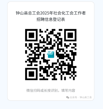 2.報名方式:采取網(wǎng)上報名方式報名。報名時(shí)間截止前,有意者請根據附件1填寫(xiě)個(gè)人簡(jiǎn)歷,并用微信掃描下方二維碼打開(kāi)小程序填寫(xiě)《鐘山縣總工會(huì )2025年社會(huì )化工會(huì )工作者招聘信息登記表》,上傳個(gè)人簡(jiǎn)歷、身份證掃描件、學(xué)歷證書(shū)掃描件、學(xué)信網(wǎng)教育部學(xué)歷證書(shū)電子注冊備案表、榮譽(yù)證書(shū)掃描件、發(fā)表文章等佐證材料,逾期不再接收任何報送材料。