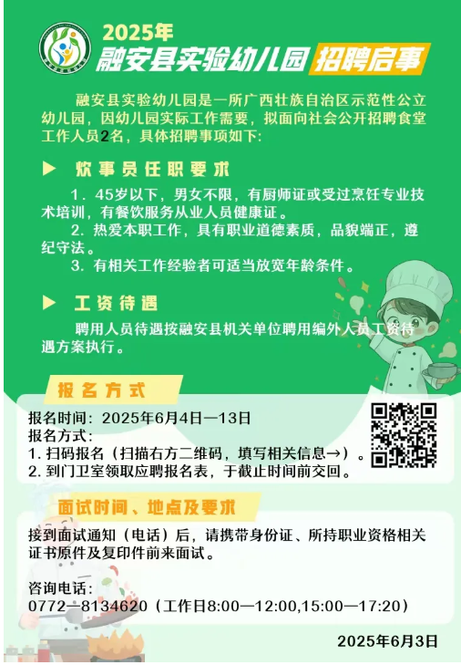2025年柳州融安縣實(shí)驗幼兒園炊事員招聘2人