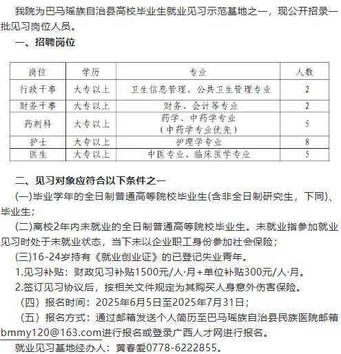 原文標題:巴馬瑤族自治縣民族醫院2025年見(jiàn)習崗位招聘公告