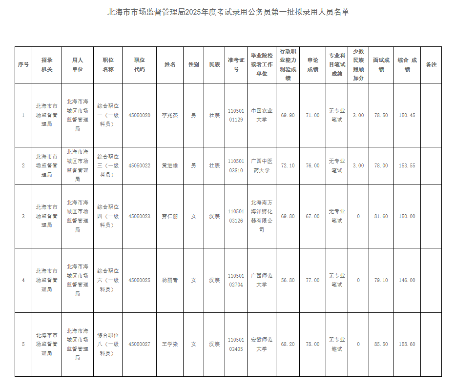 附件:北海市市場(chǎng)監督管理局2025年度考試錄用公務(wù)員第一批擬錄用人員名單