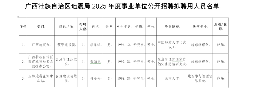 廣西壯族自治區地震局2025年度事業(yè)單位公開(kāi)招聘擬聘用人員公示