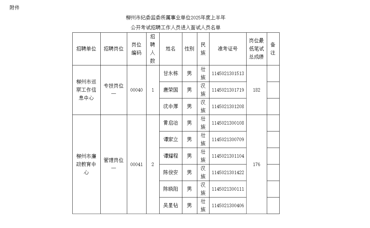 附件:《柳州市紀委監委下屬事業(yè)單位2025年度上半年公開(kāi)考試招聘工作人員進(jìn)入面試人員名單》