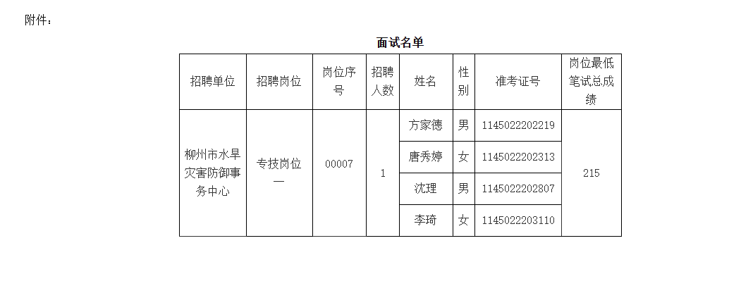 根據《柳州市2025年度上半年事業(yè)單位公開(kāi)考試招聘工作人員公告》《廣西壯族自治區事業(yè)單位公開(kāi)招聘人員實(shí)施辦法》(桂人社發(fā)〔2011〕155號)、《關(guān)于印發(fā)<廣西壯族自治區事業(yè)單位公開(kāi)招聘工作人員面試工作規則(試行)>的通知》(桂人社發(fā)〔2012〕79號)的規定,柳州市水利局擬組織所屬事業(yè)單位公開(kāi)招聘工作人員面試,現將相關(guān)事宜公告如下: