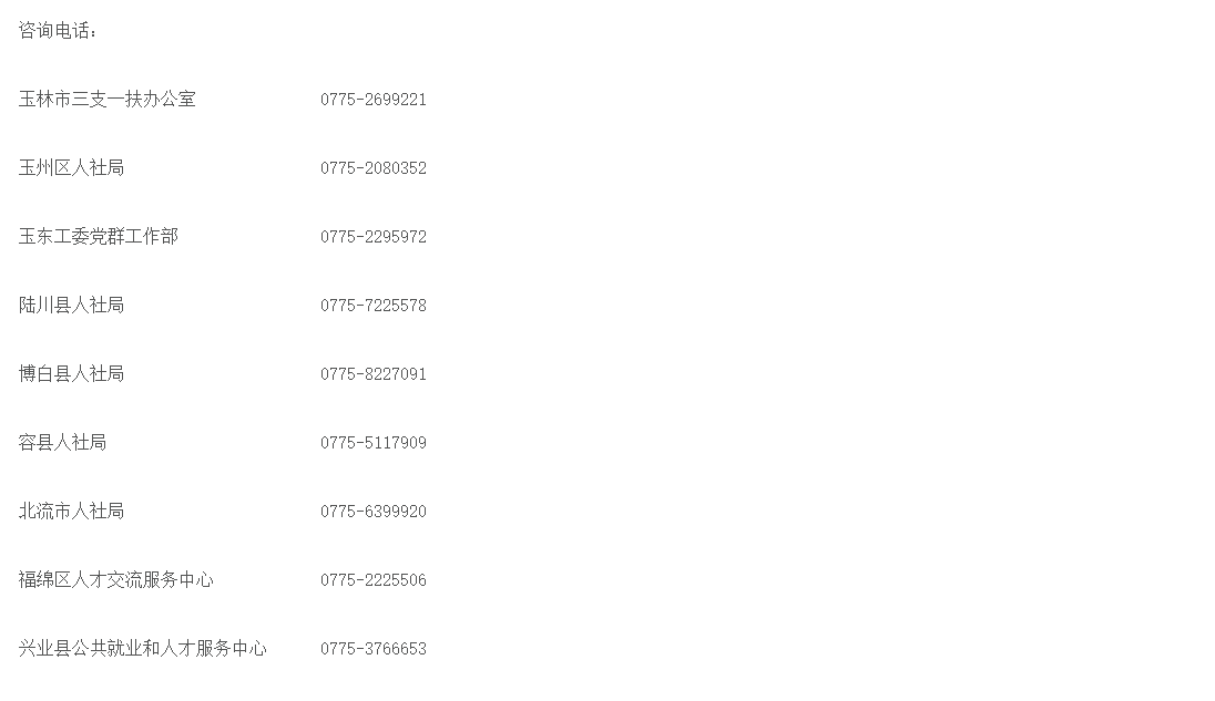 具體事宜可進(jìn)入廣西高校畢業(yè)生“三支一扶”服務(wù)網(wǎng)(http://szyf.gxrc.com)查詢(xún)政策或向玉林市“三支一扶”辦公室電話(huà)咨詢(xún)。