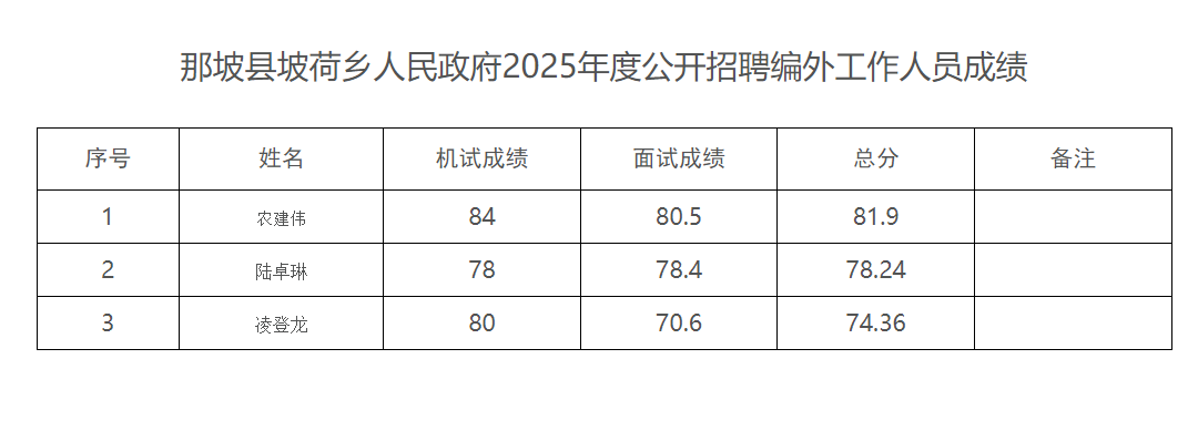 那坡縣坡荷鄉人民政府2025年度公開(kāi)招聘編外工作人員成績(jì)公示