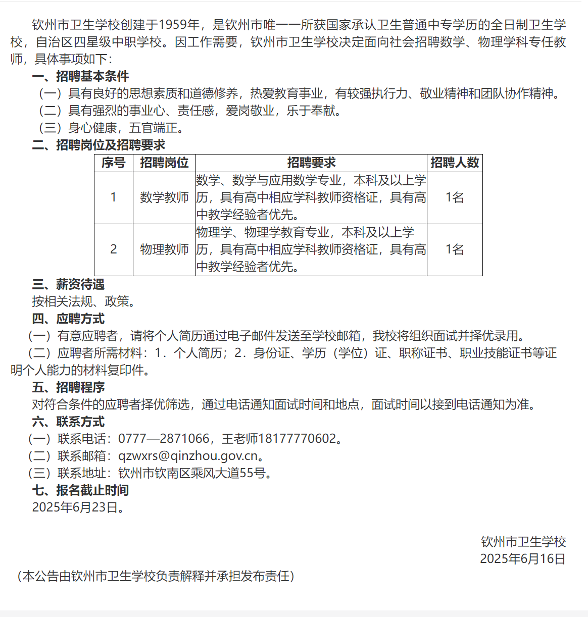欽州市衛生學(xué)校2025年公開(kāi)招聘數學(xué)、物理學(xué)科專(zhuān)任教師公告