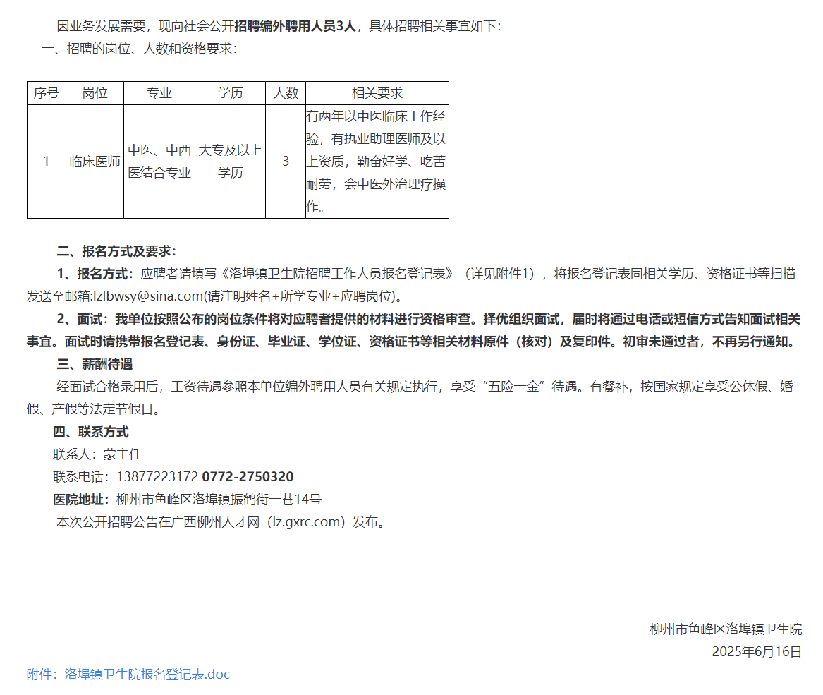 柳州市魚(yú)峰區洛埠鎮衛生院招聘3人