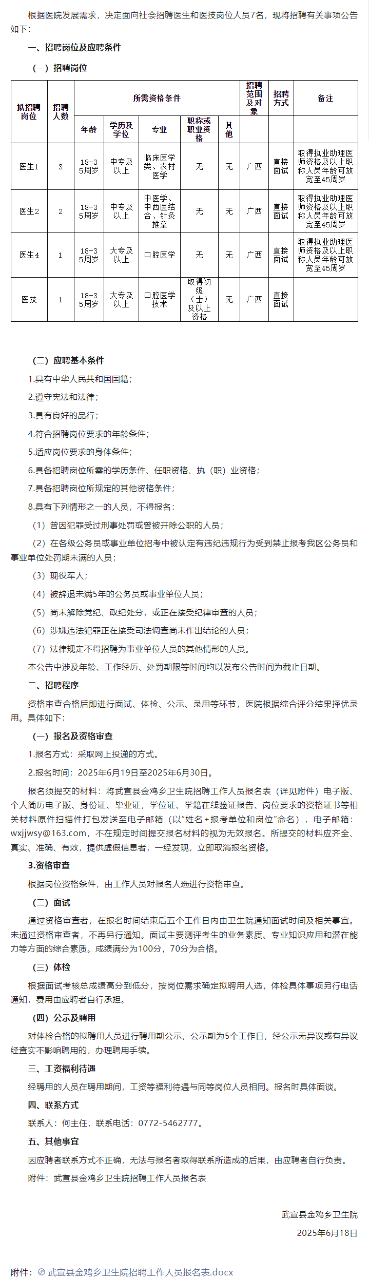 2025年武宣縣金雞鄉衛生院公開(kāi)招聘編外聘用人員7人
