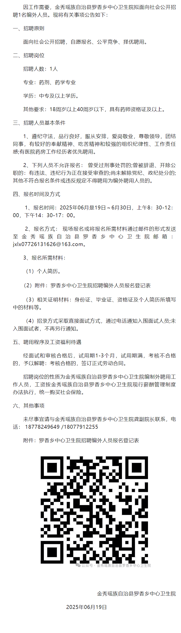 2025年金秀瑤族自治縣羅香鄉中心衛生院招聘工作人員1人