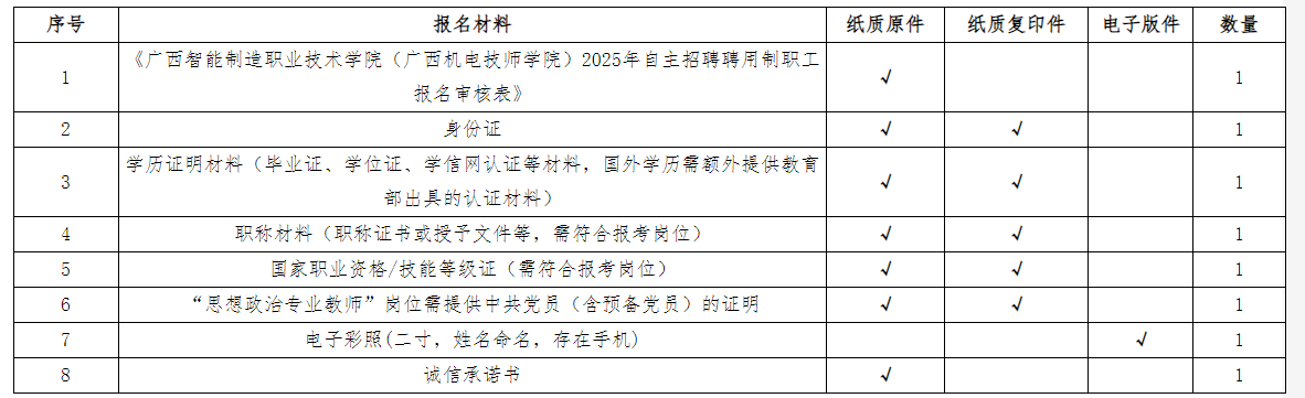 應聘者按照招聘崗位具體要求對口報名,每名應聘者限報一個(gè)崗位,采用現場(chǎng)報名遞交應聘材料的方式報名。報名人員須下載并填寫(xiě)《廣西智能制造職業(yè)技術(shù)學(xué)院(廣西機電技師學(xué)院)2025年自主招聘聘用制職工報名審核表》(附表2),同時(shí)需附上相應的學(xué)歷、學(xué)位證書(shū)、身份證、職稱(chēng)證書(shū)(相關(guān)崗位需要)等材料的原件與復印件(原件審核后退回,復印件不退回)
