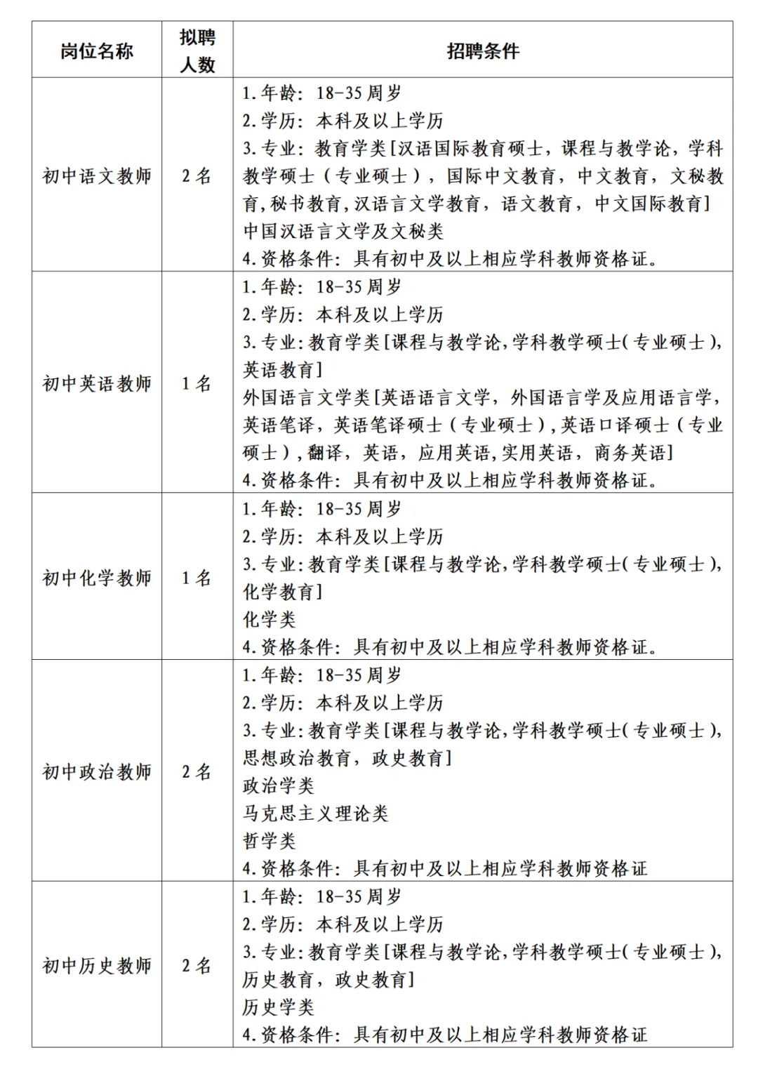 (六)18周歲以上、35周歲以下。有教學(xué)經(jīng)驗豐富、碩士研究生或中級職稱(chēng)以上的應聘人員,年齡可適當放寬到45周歲。