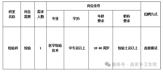 來(lái)賓市興賓區高安鄉衛生院是一家集醫療、預防保健、康復醫療于一體的國家公立基層醫療機構,現有職工45人,服務(wù)人口約2萬(wàn)人。因工作需要,我院擬向社會(huì )公開(kāi)招聘編制限額外檢驗科人員1名,現將有關(guān)招聘事項公告如下: