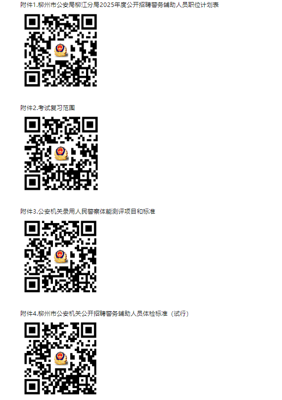 體檢依據《柳州市公安機關(guān)公開(kāi)招聘警務(wù)輔助人員體檢標準(試行)》執行(見(jiàn)附件4)。