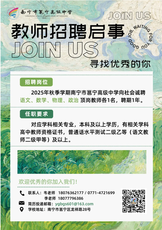 原文標題:南寧市邕寧高級中學(xué)2025年秋季學(xué)期教師招聘啟事