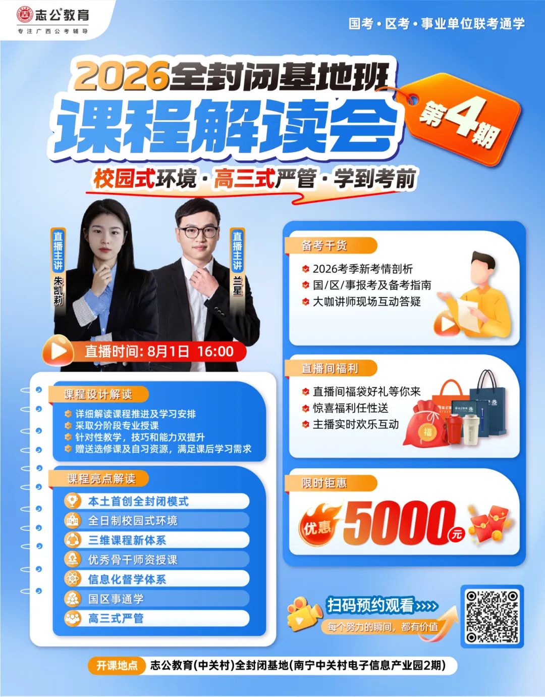 本次解讀會(huì )邀請到了朱凱莉、蘭星等資深講師。他們長(cháng)期深耕公考領(lǐng)域,對廣西的公考形勢了如指掌。在解讀會(huì )上,講師們將為大家深度剖析2026考季的新考情、分享報考及備考指南,與同學(xué)們進(jìn)行現場(chǎng)互動(dòng),更重要的是進(jìn)行2026年全封閉基地班第4期課程設計解讀!讓你在備考之初就搶占先機。????