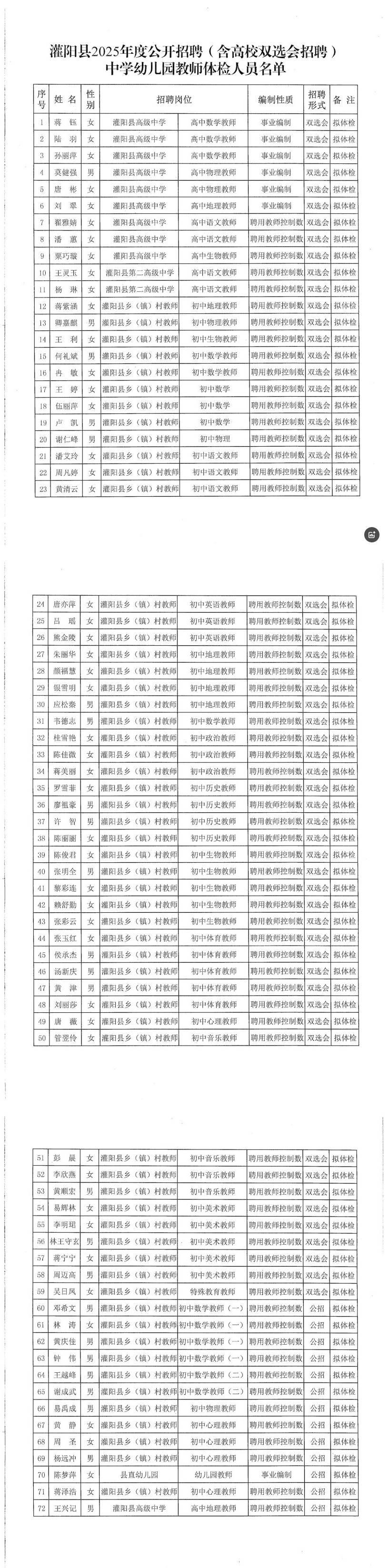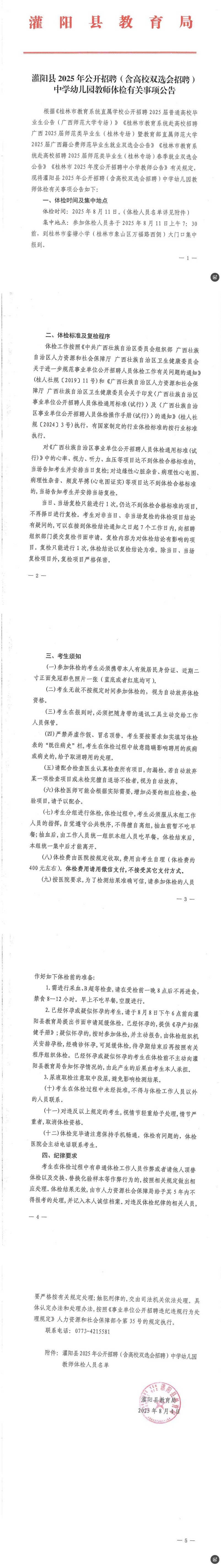 灌陽(yáng)縣2025年公開(kāi)招聘(含高校雙選會(huì )招聘)中學(xué)幼兒園教師體檢有關(guān)事項公告