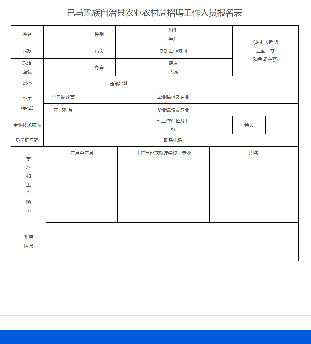 (1)《巴馬瑤族自治縣農業(yè)農村局招聘工作人員報名表》1份(詳見(jiàn)附件);