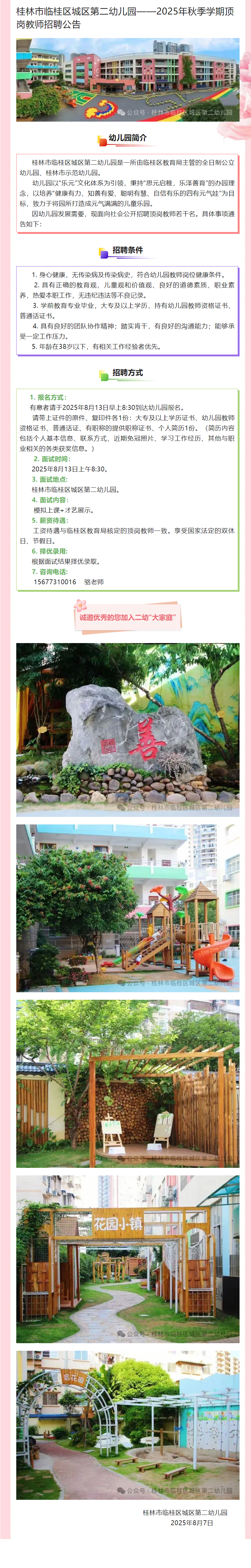 原文標題:桂林市臨桂區城區第二幼兒園——2025年秋季學(xué)期頂崗教師招聘公告