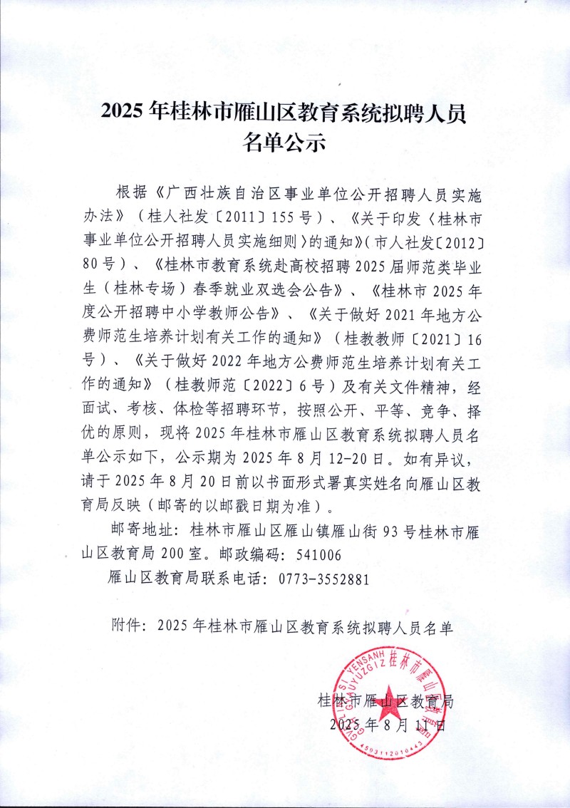 2025年桂林市雁山區教育系統擬聘人員名單公示