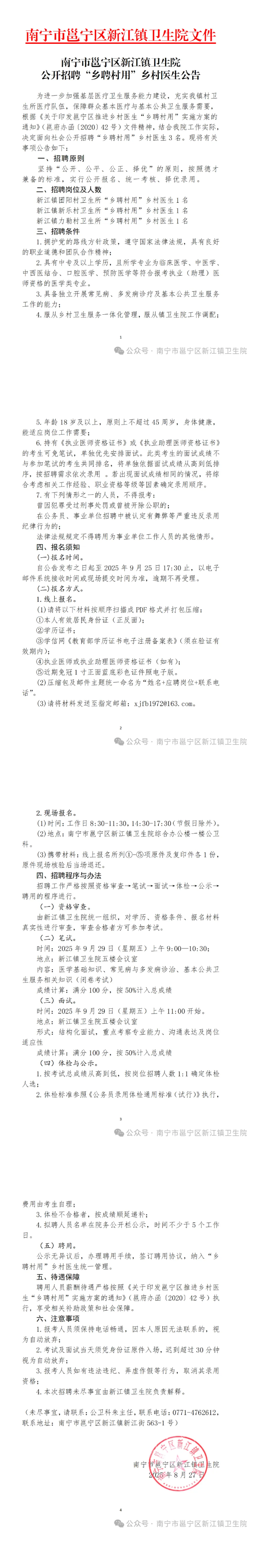 2025年南寧市邕寧區新江鎮衛生院公開(kāi)招聘“鄉聘村用”鄉村醫生公告