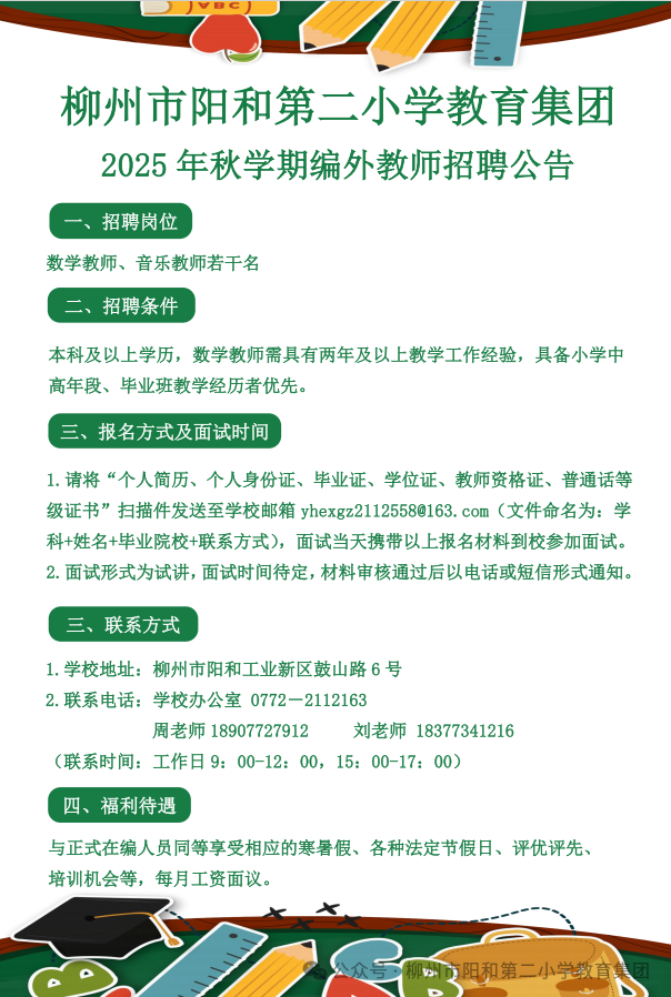 原文標題:柳州市陽(yáng)和第二小學(xué)教育集團2025年秋學(xué)期編外教師招聘公告