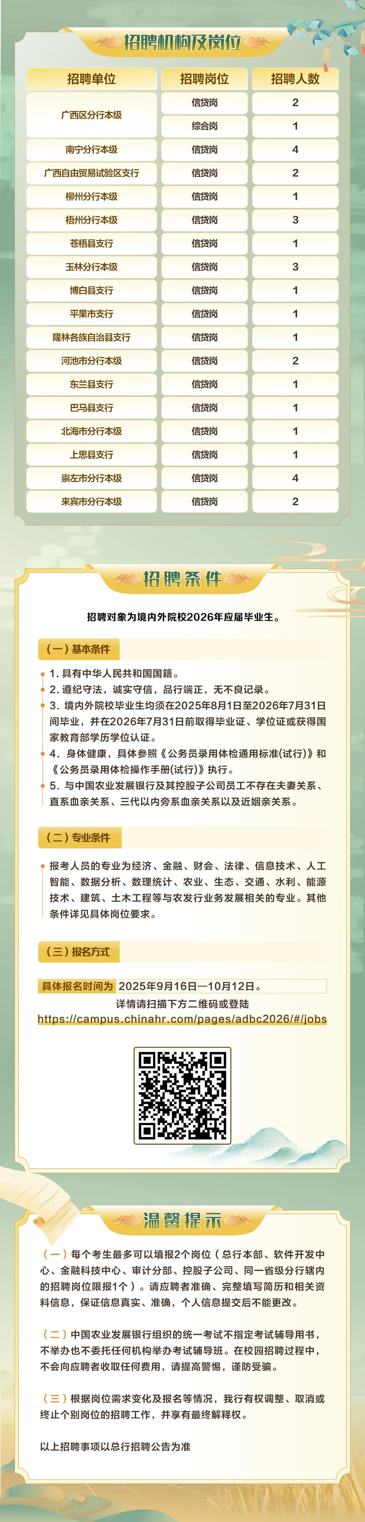 中國農業(yè)發(fā)展銀行廣西區分行2026年校園招聘正式啟動(dòng)