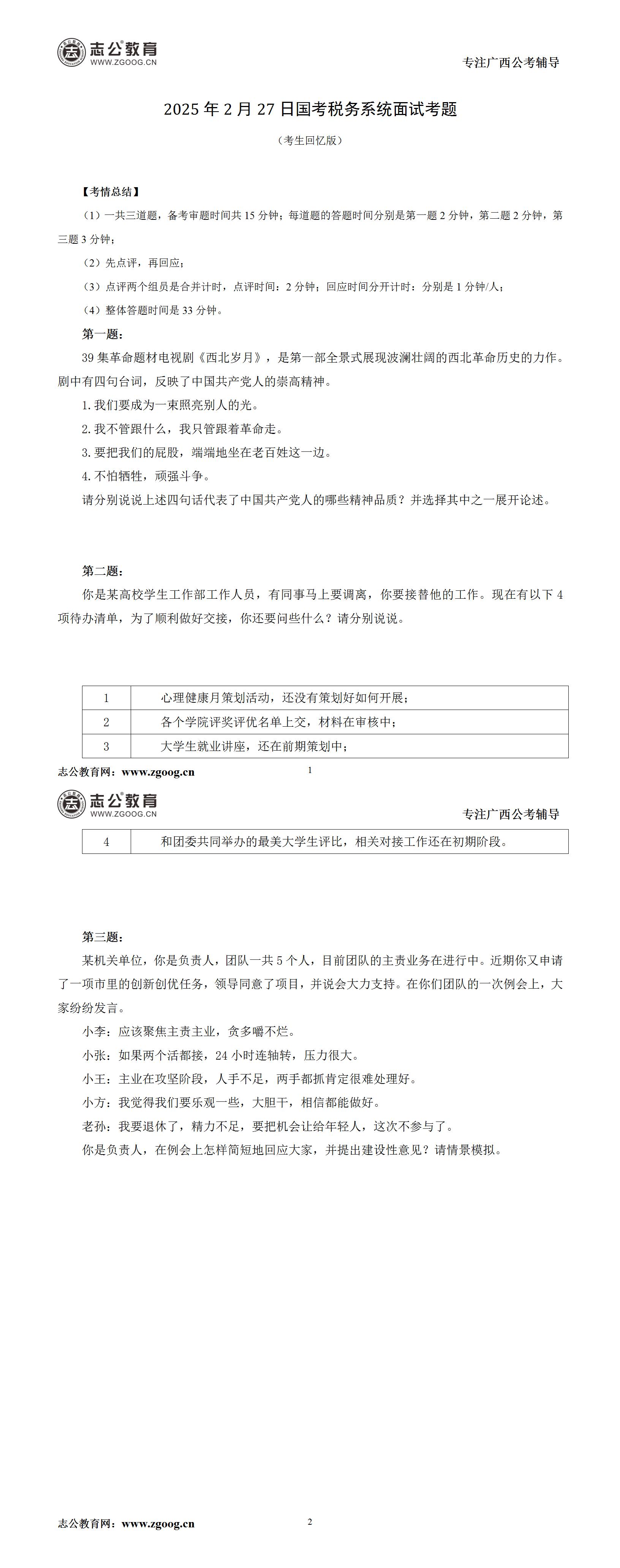 2025年國考稅務(wù)系統2月27日面試考題(考生回憶版)