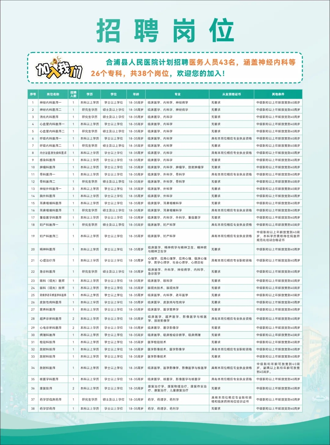 信息發(fā)布: 招聘過(guò)程中的重要通知將在微信公眾號“廣西合浦縣人民醫院”“合浦縣人民醫院”及醫院官網(wǎng)發(fā)布,請應聘人員密切關(guān)注。