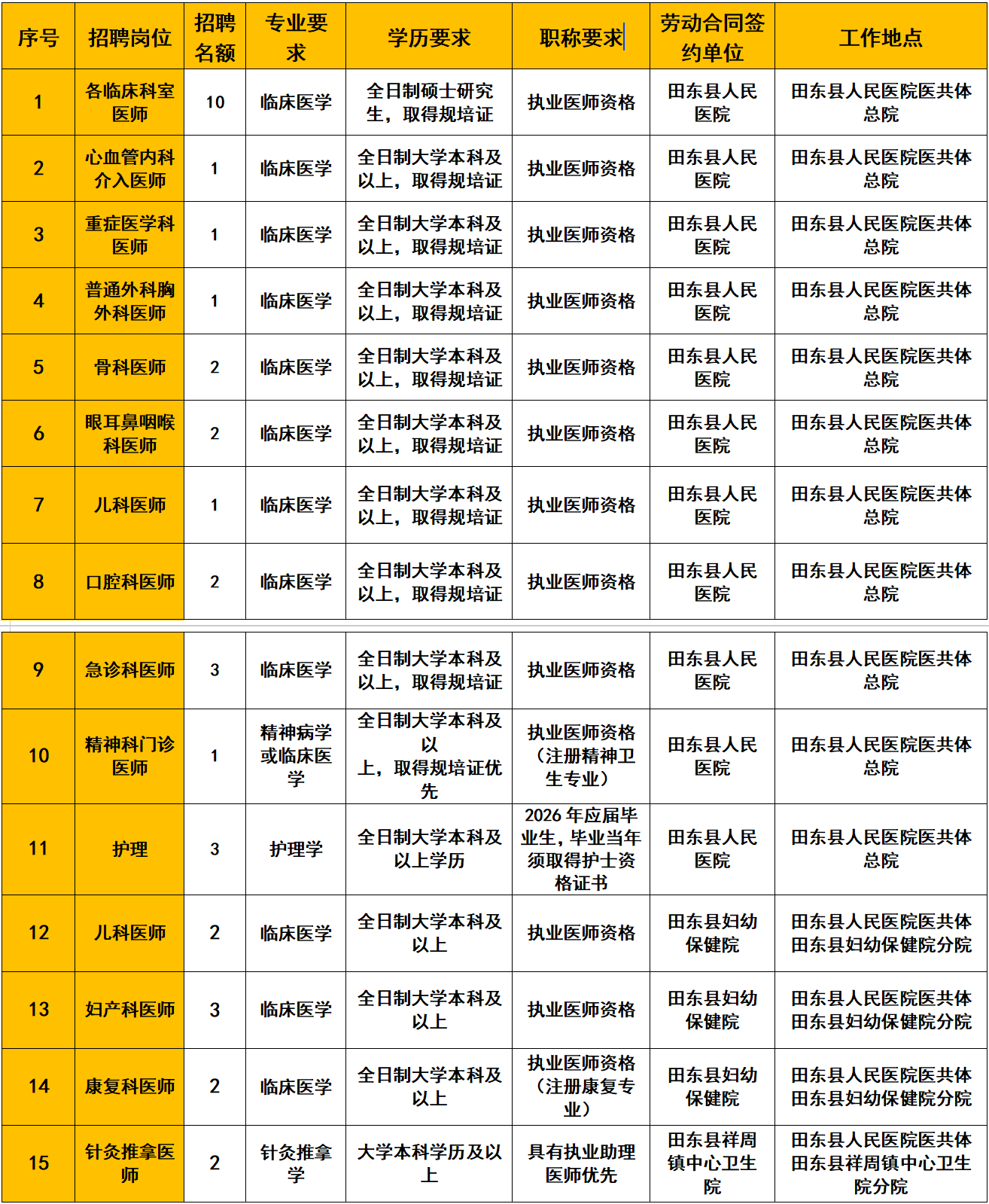 本次招聘是田東縣人民醫院醫共體總院根據總院、各分院的人才需求情況統一招聘,被錄用人員根據具體工作地點(diǎn)與相應分院或總院簽訂勞動(dòng)合同,被錄取人員的薪酬、福利待遇由相應的分院或總院按同類(lèi)型人員發(fā)放。具體招聘崗位詳見(jiàn)附件:《2026年田東縣人民醫院醫共體