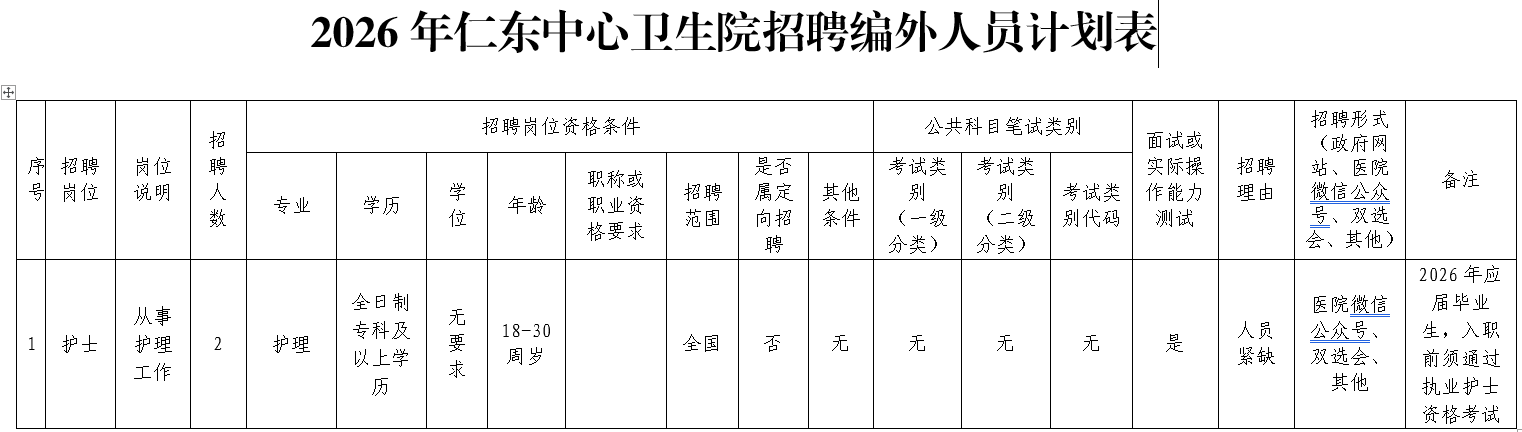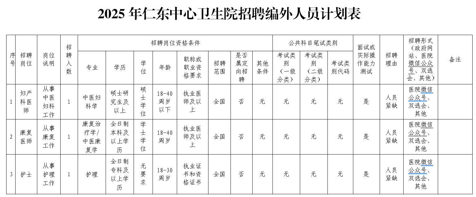 7.學(xué)歷、專(zhuān)業(yè)及其他任職要求詳見(jiàn)仁東中心衛生院招聘編外人員計劃表。