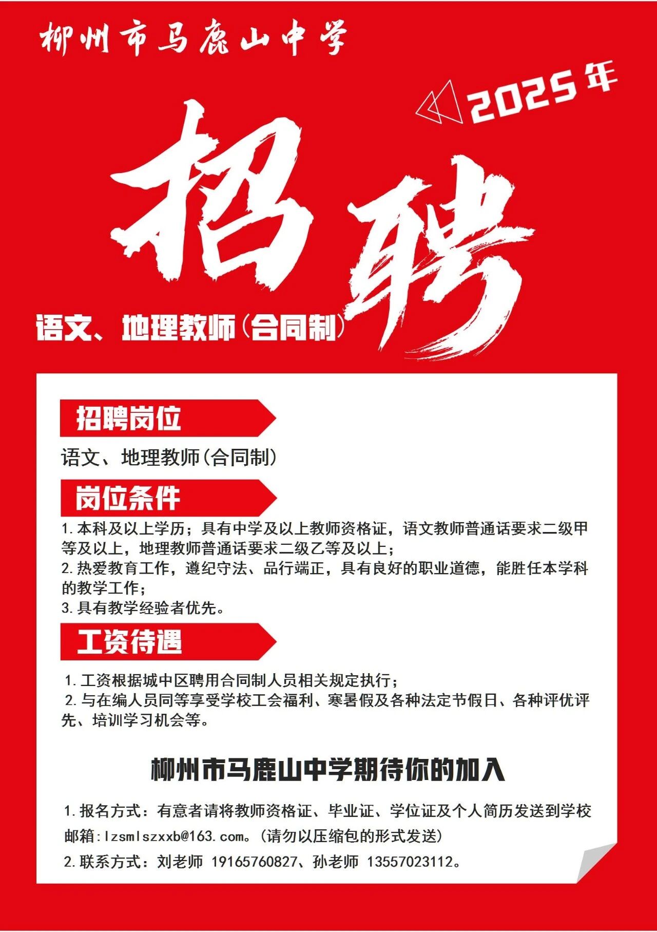 2025年柳州市馬鹿山中學(xué)招聘語(yǔ)文、地理教師