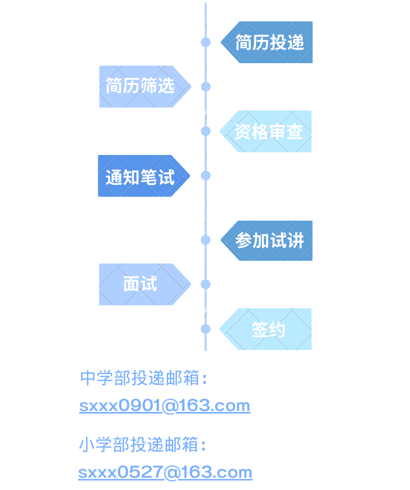 請將個(gè)人簡(jiǎn)歷(Word或PDF版本)、一張個(gè)人生活照以電子郵件附件形式發(fā)送至報名崗位對應的郵箱(如有作品,請將作品集一起發(fā)送到報名郵箱),郵件主題和附件文件名請備注:應聘學(xué)科+姓名+畢業(yè)學(xué)校。