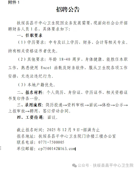 原文標題:2025年崇左扶綏縣昌平中心衛生院公開(kāi)招聘財務(wù)工作人員1人